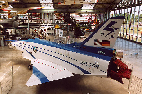 Schubvektorsteuerung kombiniert mit Entenflügeln, sogenannten Canards, verhelfen dem Versuchsflugzeug X-31 zu unglaublicher Manövrierfähigkeit. 1987 taten sich Rockwell und MBB zusammen, um einen Testträger zu bauen, der für die Erprobung zukünftiger Jagdflugzeugkonzepte verwendet werden konnte. Das Programm wurde durch das amerikanische Verteidigungsministerium und durch das Bundesamt für Wehrtechnik und Beschaffung getragen. Das Hauptaugenmerk stand in der Manövrierfähigkeit bei hohen Anstellwinkeln unter niedrigen Geschwindigkeiten und hohen G-Belastungen. Zu diesem Zweck erhielt die X-31 drei schwenkbare Paddels an dem Düsenaustritt des F404-GE-400 Triebwerks. Im künstlich stabilisierten Flug hilft ein hochmodernes computergesteuertes Flugreglersystem das ausgeklügelte Wechselsystem zwischen den Steuerflächen und Schubvektordüsen zu koordinieren. Diese Hightech-Kombination führt zu einer noch nie dagewesenen Manövrierfähigkeit, die jedes herkömmliche Jagdflugzeug im Luftkampf alt aussehen lässt. Im simulierten Luftkampf hatte die agile FA-18 Hornet keine Chance. Das Hauptproblem in den engen Luftkämpfen vermochte auch die X-31 nicht lösen, die Piloten sind diese plötzlichen und häufig abrupten Beschleunigungsänderungen nach wie vor nicht gewachsen.