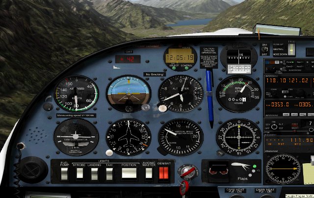 Das VC (Virtuelles Cockpit) bietet wahrlich einen Augenschmaus. Eines der Highlights ist, dass der Pilot und die Co-Pilotin in 3D dargestellt werden. Die Instrumente sind scharf und sehr gut ablesbar. Alle Schalter lassen sich bedienen, und so steht einem schönen VC-Flug nichts im Wege. Nun kommt der einzige Punkt, welcher mir im Virtuellen Cockpit nicht gefallen hat, nämlich dass man das GPS (Global Positioning System) nicht direkt am Gerät selber „an“ und „ab“ stellen lässt. Das GPS bietet die gleiche Funktionalität, wie das Standart-GPS des Flightsimulators. Das positive am GPS ist, dass es nicht allzu klein ist, man muss also nicht das separate GPS Fenster des Flusi öffnen. Sehr schön im VC ist auch, dass der „Spiegeleffekt“ an der Cockpit-Scheibe sichtbar ist, somit wirkt alles viel realistischer. Die Instrumente reagieren sehr flüssig und sind hochauflösend dargestellt.